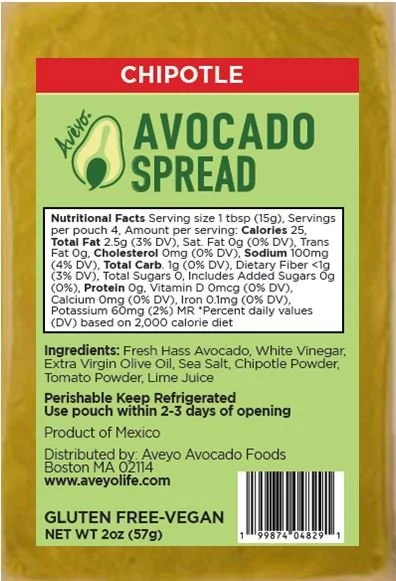 Our Aveyo Chipotle Spread is perfectly blended to deliver a rich and creamy texture and smoky balanced heat. Made with over 80% fresh hand scooped Hass Avocado our Chipotle Spread makes any dish taste better and makes it better for you. Because avocados are the main ingredient and not oil it is also 75% less fat and calories than traditional oil based mayos and spreads. The convenient 2oz pouch makes it easy to spread on all of your favorite dishes. Get ready to spread it!